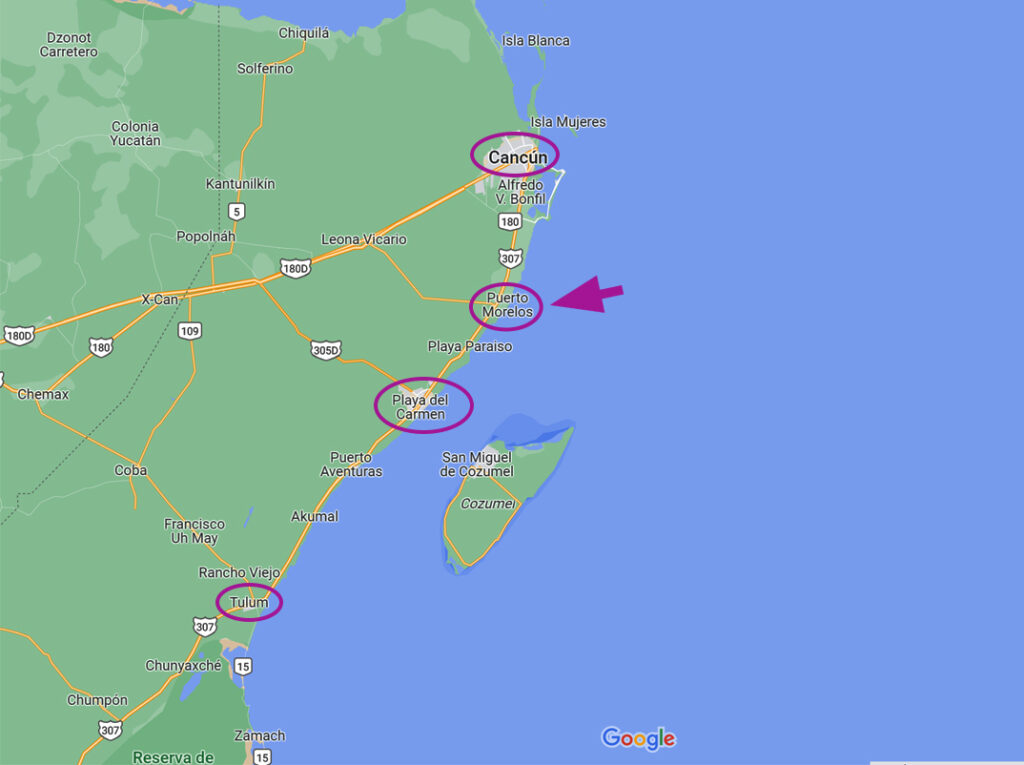 If you’re on foot like me, you want to be as close to the center as possible. I recommend staying in the grey zone shown on the map. Part of what is considered to be Puerto Morelos is away from the beach and on the highway. While there are probably some nice places to stay